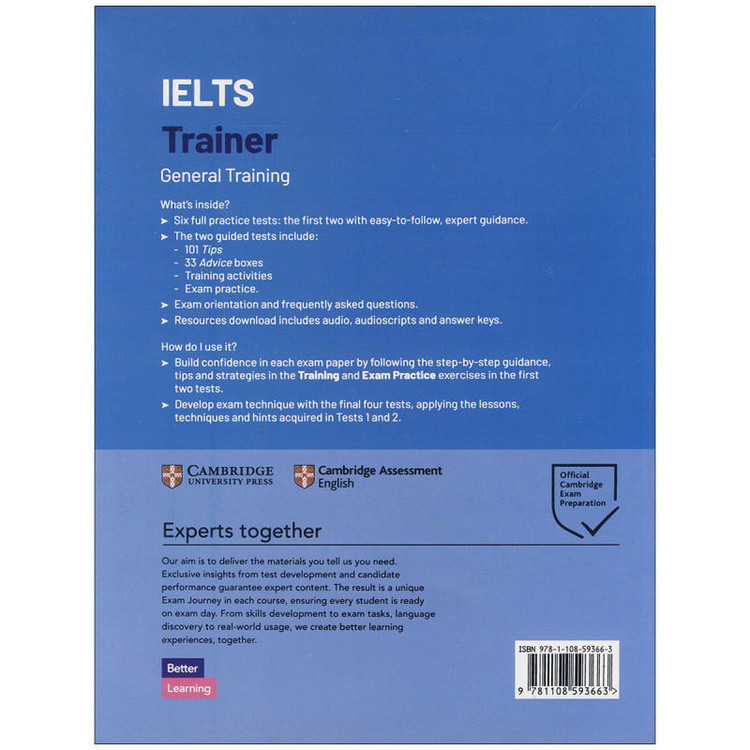 دیدن محصولات مرتبطCambridge Ielts Trainer 2 یک مجموعه دو جلدی برای تمرین آزمون آیلتس است که از انتشارات کمبریج منتشر شده است. این مجموعه شامل دو کتاب میباشد که یکی مربوط به آزمون آیلتس جنرال و دیگری مربوط به آزمون آکادمیک است. این دو کتاب به صورت کاملا خود آموز هستند که میتوانند در کلاس درس و یا توسط خود زبان آموز در منزل مطالعه شوند و علاوه بر فایل صوتی، پاسخ تمامی تمرین ها به همراه متن فایل های صوتی در فایل جداگانه ای برای هر کتاب ارائه شده است. سطح در کتاب برای افرادی است که قصد کسب نمره 6 یا بیشتر در آزمون IELTS را دارند. هر دو کتاب دارای شش آزمون هستند که تمامی آزمون ها در سطح آزمون اصلی آیلتس طراحی شده است.