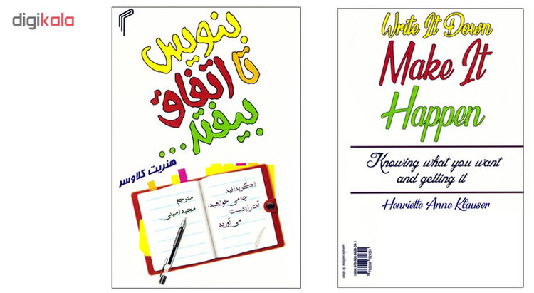 "بنویس تا اتفاق بیفتد" با نام انگلیسی "Write It Down, Make It Happen" اثر برجسته هنریت کلاوسر، نویسنده مشهور کتب روانشناسی موفقیت است که از تاثیرگذارترین و مهمترین منابع راهکارهای موفقیت و فراگیری اصول مهم خودباوری و تحول می باشد؛ نه تنها در کسب و کار و نیل به موفقیت مالی، بلکه در تمامی زمینه ها و جنبه های مختلف زندگی. این کتاب را درکنار کتاب های مشهور و موفق دیگری چون "اثر مرکب" ، "چهار اثر از فلورانس اسکاول شین" و دیگر آثار مشهور در زمینه موفقیت و هدف گزینی قرار داده اند. می توان گفت چکیده کتاب بروی روی جلد آن آمده است: اگر بدانید چه می خواهید، آن را به دست خواهید آورد. نویسنده معتقد است اگر سررشتهی امور زندگیتان را به دست بگیرید و آنها را اداره کنید میتوانید به رویاهایتان جامهی عمل بپوشانید. با نوشتن، حوادث اتفاق میافتند، دکتر هنریت آن کلاوسر به شما چگونگی آن را آموزش میدهد و خاطر نشان میکند، نوشتن هدفها به شما کمک خواهد کرد به خواستههایتان برسید. شما در این کتاب داستانهایی در مورد مردم عادی میخوانید که معجزات بزرگ و کوچکی در زندگی خود دیدهاند، کسانی که نوشتن آرزوها در زندگیشان نقش اساسی بازی کرده و رویاهای آنها را تبدیل به حقیقت کرده است. راهنماییهای همه جانبهی دکتر کلاوسر و تمرینات بسیار آسانی که ارائه داده است مطمئنا حس خلاقیت و اعتماد به نفس شما را افزایش داده و بلیط مسیر موفقیت را در دستان شما قرار خواهد داد. این کتاب با ترجمه مجید امینی توسط انتشارات تیموری چاپ و دراختیار علاقه مندان قرار گرفته است.