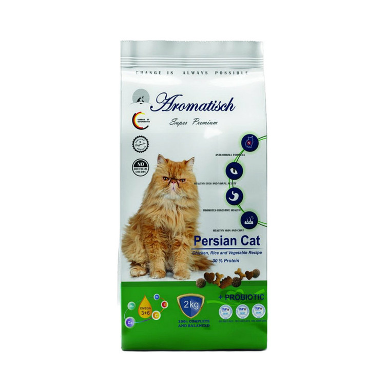 غذای گربه پرشین آروماتیش با فرمولاسیون آلمانی و کیفیت سوپر پریمیوم حاوی گوشت مرغ- برنج سبزیجات میباشد . این محصول دارای باکتری های فعال پروبیوتیک می باشد که به هضم و جذب بهتر غذا کمک کرده و به علاوه باعث تقویت دستگاه گوارش گربه ها می شود . این محصول دارای ویتامین های ضروری و اسیدهای چرب امگا سه و شش می باشد
